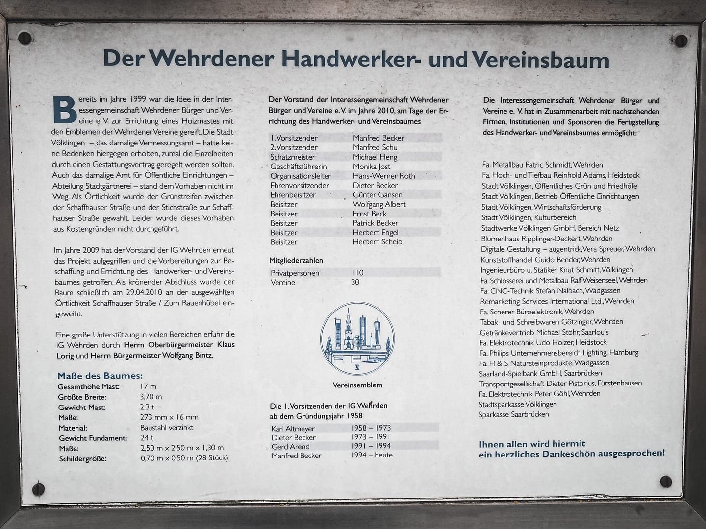 Ein Highlight war auch die Errichtung eines Handwerker- und Vereinsbaumes im Einmündungsbereich Schaffhauser Str./Zum Rauenhübel am 29.04.2010. Dieses Projekt ist von seiner Gestaltung her einzigartig. An der dort installierten Erinnerungstafel sind alle projektbezogene Einzelheiten nachzulesen. Am 02.09.2011 erfolgte die Fertigstellung des 2. und 3. Bauabschnittes. An diesem Tage wurde mit einer Festivität die Aufstellung der Wappen der Völklinger Partnerstädte Forbach, Ars-sur-Moselle und Les Lilas gefeiert. Ebenfalls wurden die Wappen der Stadt Völklingen und des Saarlandes sowie das Vereinsemblems der IG Wehrden e.V. ihrer Bestimmung übergeben.